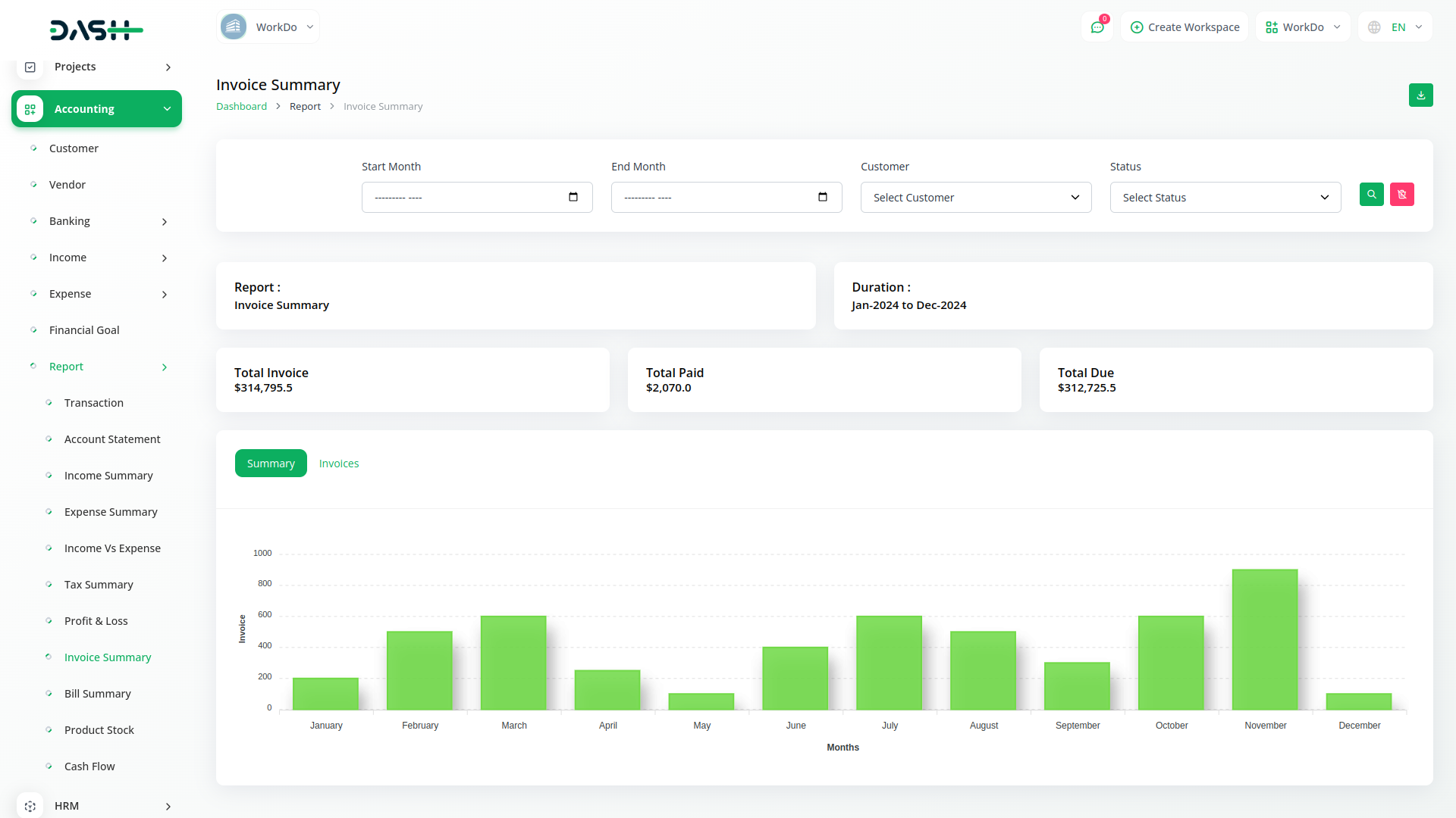 รับรายงานธุรกรรมด้วยตัวเลือกการกรองที่ง่ายดาย ดาวน์โหลดรายงานบัญชีที่ต้องการในรูปแบบ PDF, CSV หรือ Excel คุณจะได้รับรายงานที่จัดทำอย่างเหมาะสมเกี่ยวกับรายได้ ค่าใช้จ่าย ภาษี ใบแจ้งหนี้ และสรุปใบแจ้งหนี้แต่ละรายการ กรองรายงานตามบัญชี หมวดหมู่ และลูกค้า นอกจากนี้ การแสดงกราฟแสดงรายได้และค่าใช้จ่าย พร้อมการคำนวณกำไรขาดทุนอย่างละเอียดจะช่วยให้คุณตัดสินใจได้อย่างชาญฉลาด กรองรายงานสรุปภาษีและแผนภูมิรายได้และค่าใช้จ่ายตามปีงบประมาณ